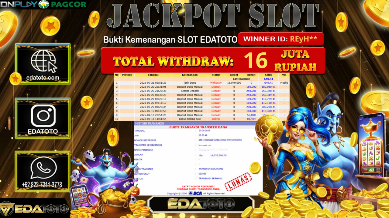 Selamat Kepada Pemilik user ID : REyH** Hari/Tanggal : Senin/ 21, September 2025 Jackpot : Rp. 16.070.000 JT Permainan : . . .