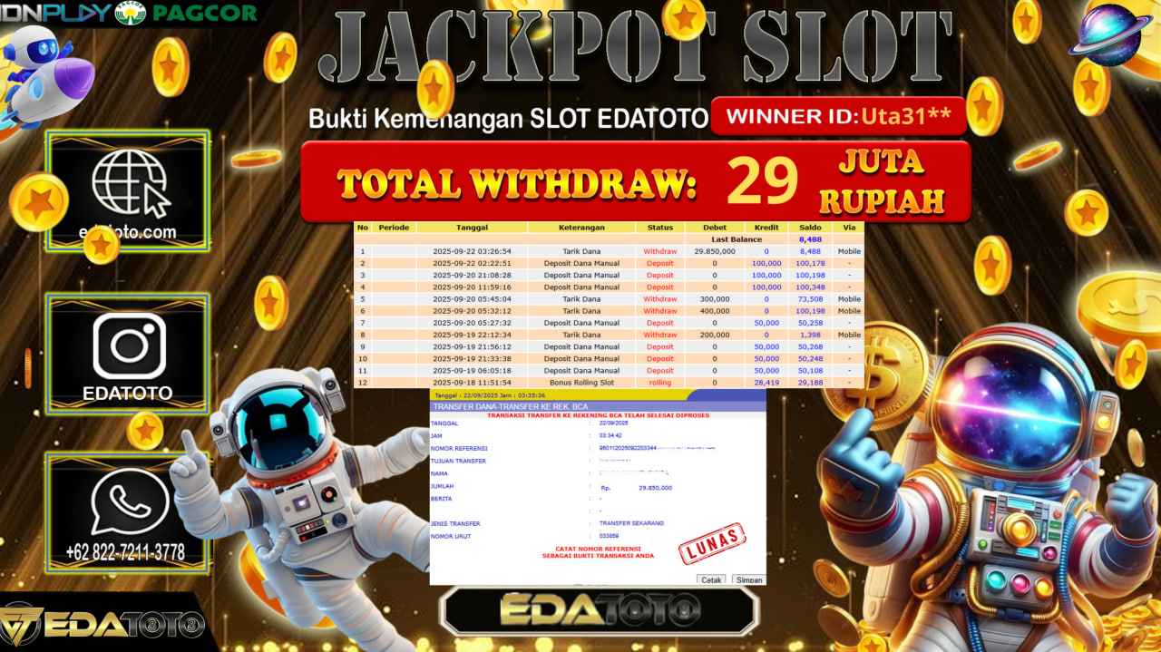 Selamat Kepada Pemilik user ID : Uta31** Hari/Tanggal : Senin/ 22, September 2025 Jackpot : Rp. 29.850.000 JT Permainan : . . .