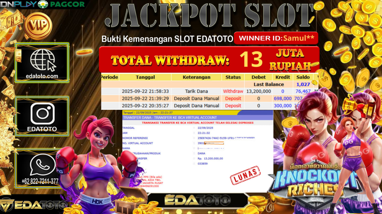 Selamat Kepada Pemilik user ID : Samul** Hari/Tanggal : Senin/ 22, September 2025 Jackpot : Rp. 13.200.000 JT Permainan : . . .