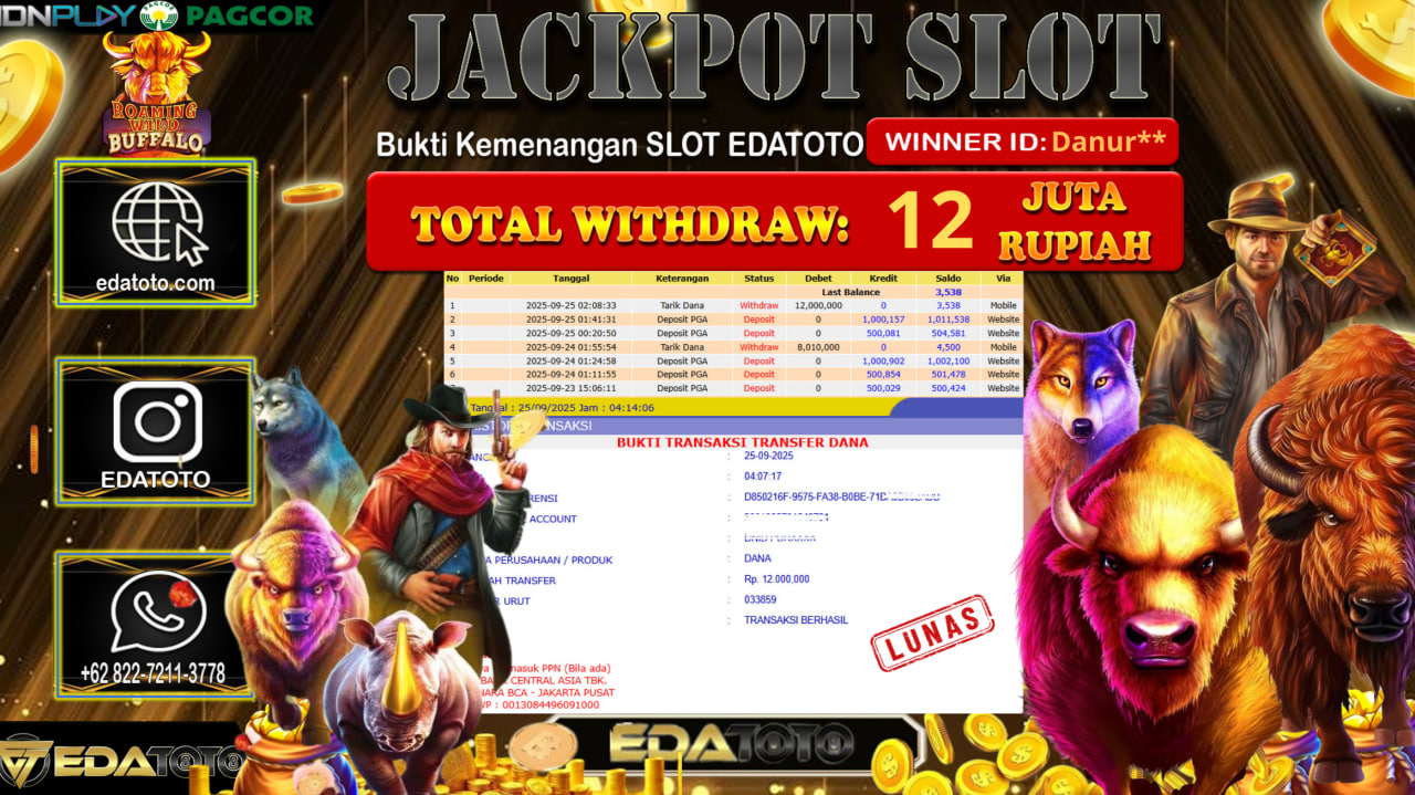 Selamat Kepada Pemilik user ID : Danur** Hari/Tanggal : kamis/ 24, September 2025 Jackpot : Rp. 12.000.000 JT Permainan : . . .