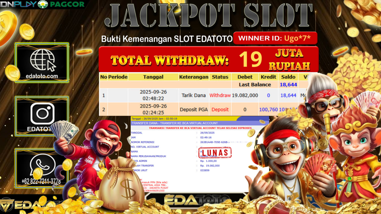 Selamat Kepada Pemilik user ID : Ugo*7* Hari/Tanggal : Jum,at/ 25, September 2025 Jackpot : Rp. 19.082.000 JT Permainan : . . .