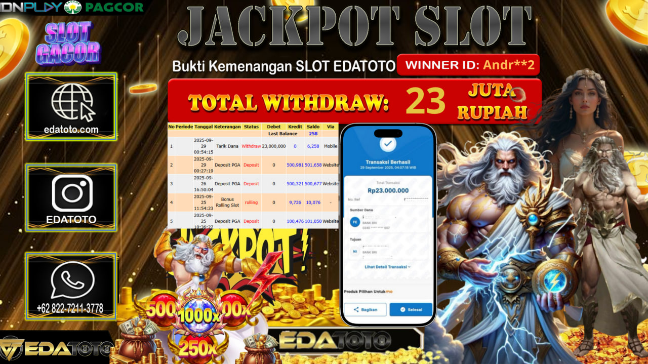 Selamat Kepada Pemilik user ID : Andr**2 Hari/Tanggal : Senin/ 29, September 2025 Jackpot : Rp. 23.000.000 JT Permainan : . . .