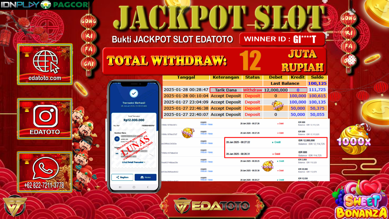 Selamat Kepada Pemilik user ID : GI****t Hari/Tanggal : Selasa/ 28 , JANUARY 2025 Jackpot : Rp. 12.000.000 JT Permainan . . .