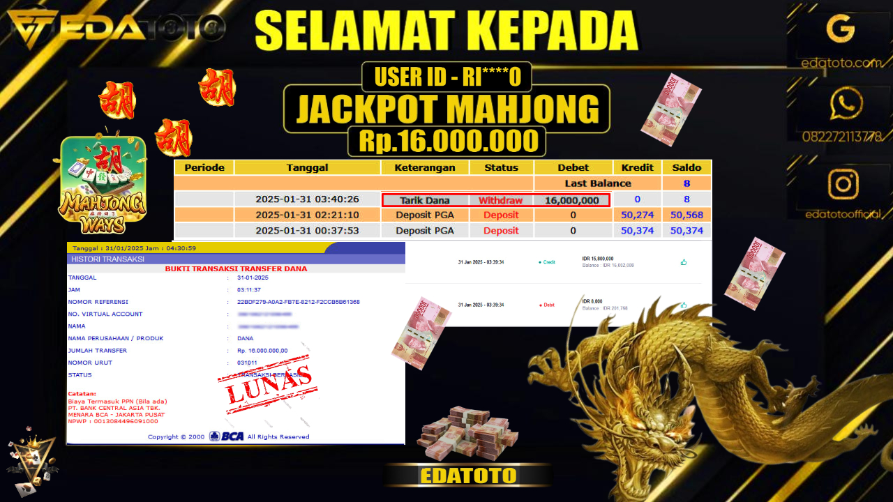 Selamat Kepada Pemilik user ID :RI****0 Hari/Tanggal : JUMAT/ 31 , JANUARY 2025 Jackpot : Rp. 16.000.000 JT Permainan : . . .