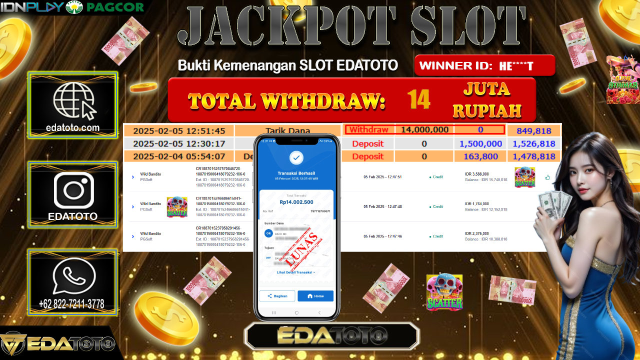 Selamat Kepada Pemilik user ID :HE****T Hari/Tanggal : Kamis / 06 , FEBRUARY 2025 Jackpot : Rp. 14.000.000 JT Permainan . . .