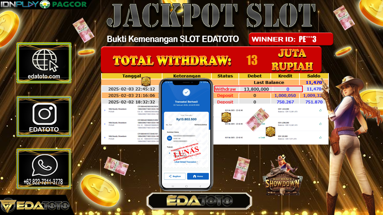 Selamat Kepada Pemilik user ID :RE****X Hari/Tanggal : Senin / 03 , FEBRUARY 2025 Jackpot : Rp. 20.000.000 JT Permainan . . .