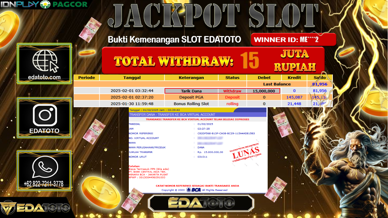 Selamat Kepada Pemilik user ID :ME****2 Hari/Tanggal : SABTU/ 01, FEBRUARY 2025 Jackpot : Rp. 15.000.000 JT Permainan : Jackpot . . .