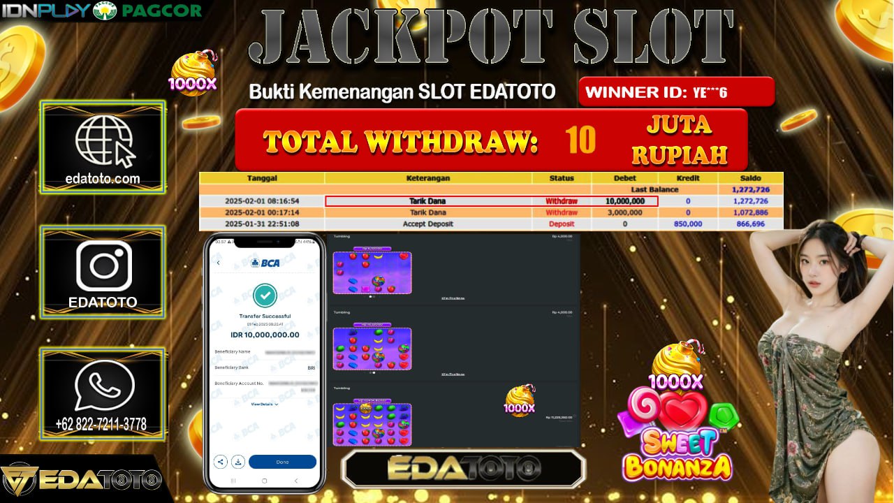 Selamat Kepada Pemilik user ID : YE***6 Hari/Tanggal : Minggu/ 02 , FEBRUARY 2025 Jackpot : Rp. 10.000.000 JT Permainan . . .