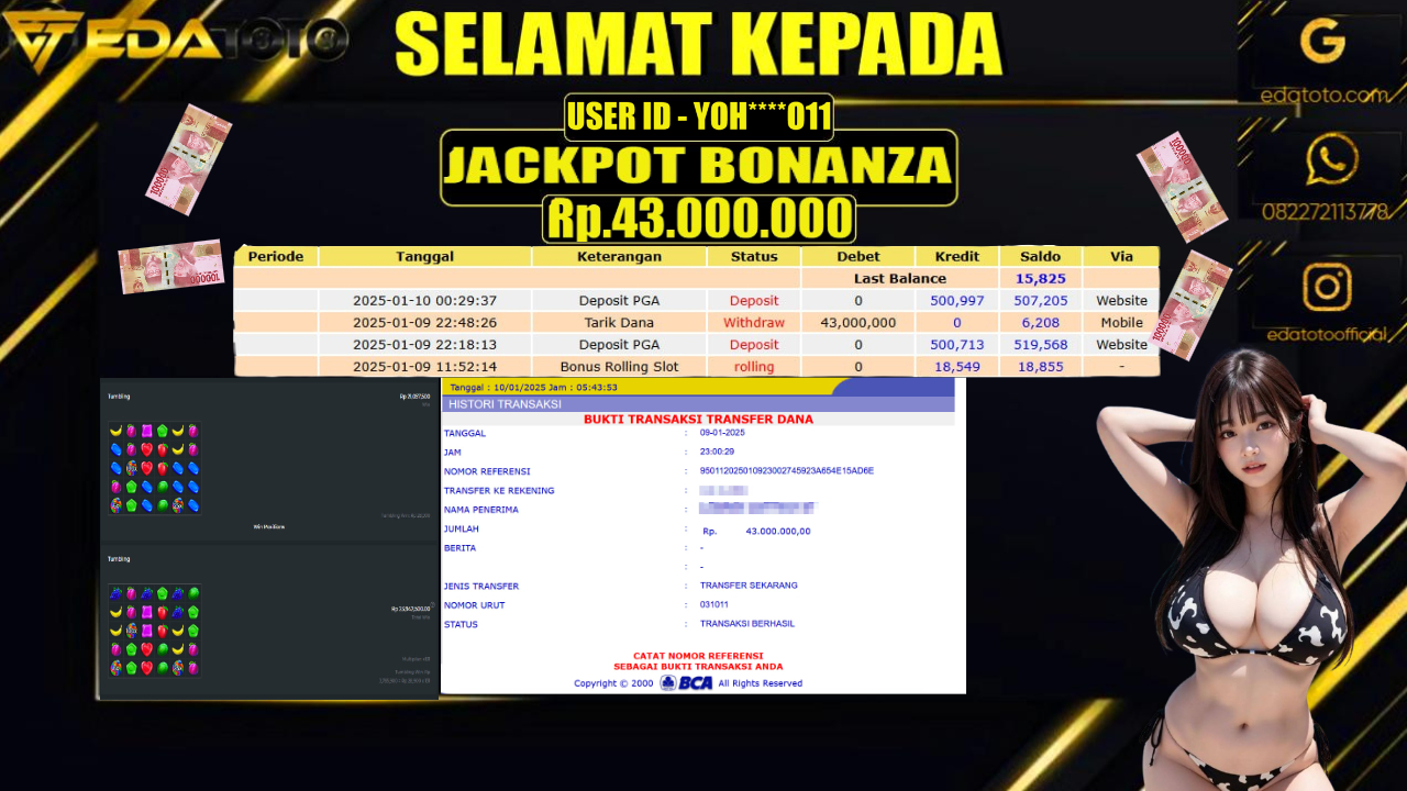 Selamat Kepada Pemilik user ID : YOH****O11 Hari/Tanggal : JUMAT/ 10 JANUARY 2025 Jackpot : Rp. 43.000.000 JT Permainan : . . .