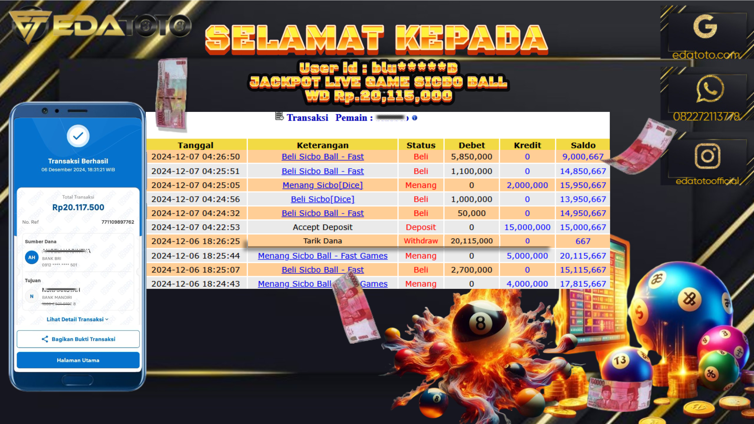 Selamat Kepada Pemilik user ID : ED*****I Hari/Tanggal : Jumat/ 12 DESEMBER 2024 Jackpot : Rp. 20.000.000 JT Permainan : . . .