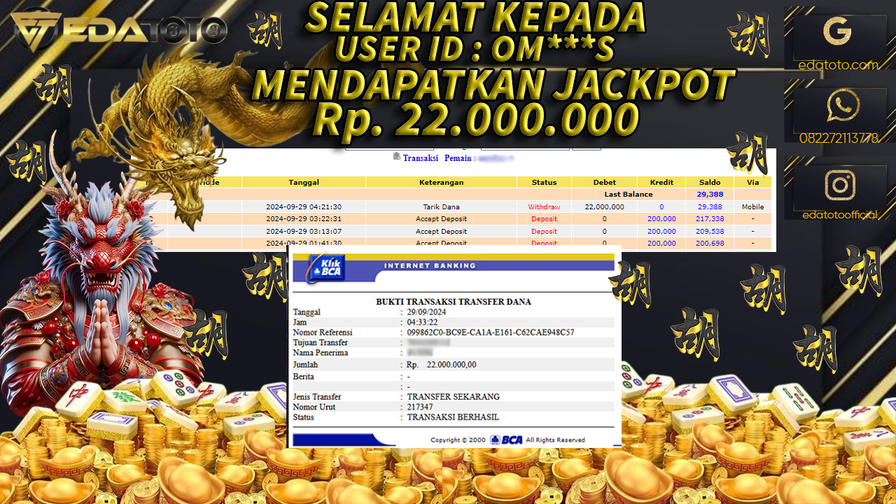 Selamat Kepada Pemilik user ID : OMU*****S Hari/Tanggal : Jumat/ 21 DESEMBER 2024 Jackpot : Rp. 22.000.000 JT Permainan : . . .