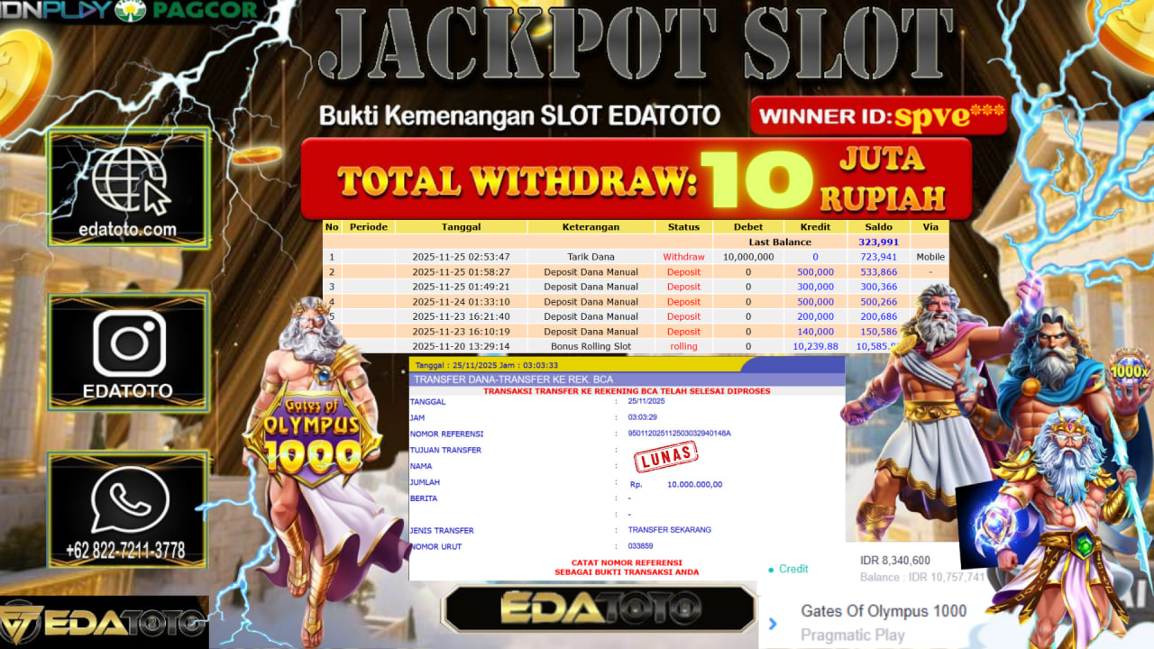 Selamat Kepada Pemilik user ID : ULAR*** Hari/Tanggal :Sabtu / 20, November 2025 Jackpot : Rp. 9,000,000 JT Withdraw :10,000,000 JT . . .