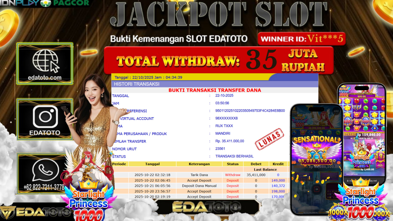 Selamat Kepada Pemilik user ID : Vit***5 Hari/Tanggal : Rabu / 22, Oktober 2025 Jackpot : Rp. 35.411.000 JT Permainan . . .